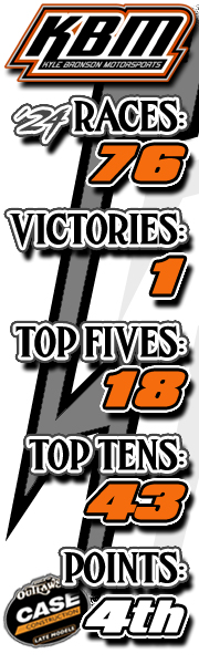 (August 25, 2024) The Kyle Bronson Motorsports (KBM) team was back on the World of Outlaws CASE Construction Late Model Series grind over the August 23-24 weekend at Atomic Speedway in Alma, Ohio. The two-day 'Fireball 50' started on Friday night with a $10,000 to win showdown. Kyle Bronson placed fifth in his heat race and second in his B-Main prior to passing ten competitors during the 40-lap feature en route to a steady eighth place performance. In Saturday's main event with a $15,000 payday on the line, Kyle grabbed the fourth and final transfer spot through his heat race before picking off six cars during the 50-lapper on his way to a ninth place showing. Complete results from the doubleheader weekend in the Buckeye State can be viewed online by clicking on www.woolms.com.